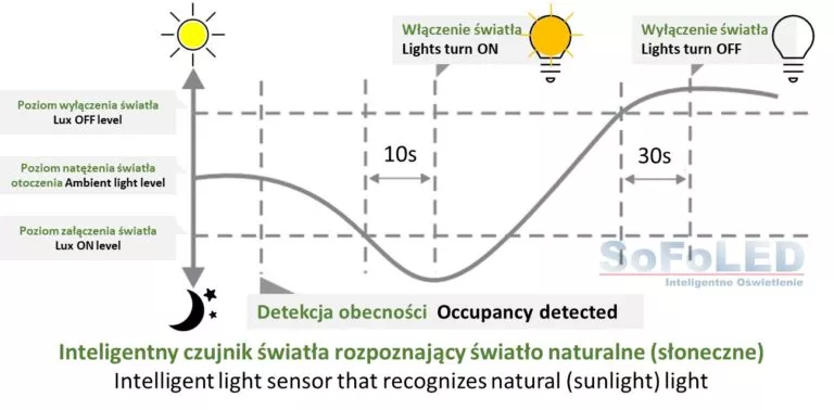 Po pierwsze, dzięki unikalnemu rozwiązaniu podwójnego czujnika światła potrafi rozróżniać światło słoneczne od światła sztucznego a to oznacza, że wraz z pojawieniem się światła słonecznego automatycznie, za pomocą wyjścia z sygnałem 0-10V po detekcji ruchu przez mikrofalowy czujnik ruchu, czujnik HNS111DH2-SFL zmniejsza proporcjonalnie moc świecenia oprawy oświetleniowej w zadanym czasie „HOLD” .