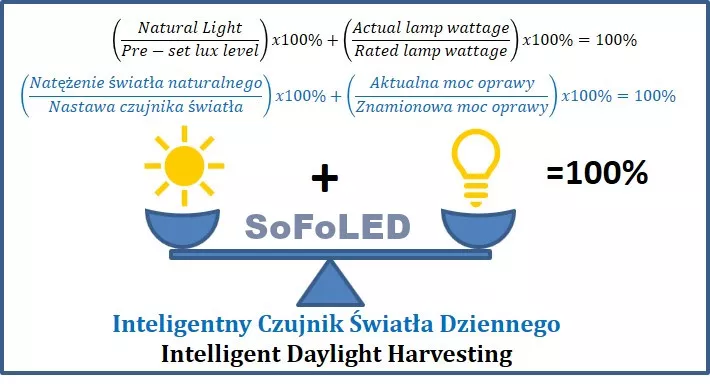 Natomiast, w odniesieniu do możliwości dezaktywacji mikrofalowego czujnika ruchu. Z pewnością należy tu wspomnieć, że czujnik zainstalowany w pomieszczeniach typu biuro, klasa szkolna z włączoną tylko funkcją mieszania światła sztucznego i naturalnego przynosi oszczędności w zużyciu energii elektrycznej na poziomie 81% do 85% w stosunku do oświetlenia fluorescencyjnego. W rezultacie, efektywnie oszczędzając energie elektryczną, system zarządzania światłem doskonale poprawia warunki pracy ludzi nie dopuszczając do prześwietlania stanowisk pracy.